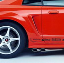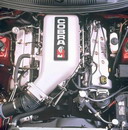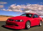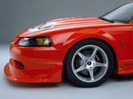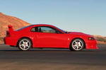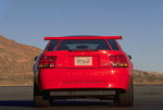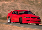2000 SVT Cobra R Produces 385 Horsepower The all-new 2000 Ford SVT Mustang Cobra R, wearing its production Performance Red paint, was displayed for the first time at the Specialty Equipment Market Association's (SEMA) annual convention. Built with the race track in mind, the Cobra R features a 5.4L 32-valve V8 engine, solidifying the modular family of engines as the high-performance benchmark in Ford's lineup. The Cobra R V8 produces an estimated 385 horsepower and 385 foot pounds of torque. In order to keep this power on the ground, the Cobra R features exterior enhancements including a front air-splitter and tall rear deck spoiler, which create downforce for increased stability at track speeds. Other differences to the Cobra R include the "power dome" hood, which was required in order to fit over the Cobra R's unique intake manifold. The Cobra R rides on 18-inch wheels shod with BFGoodrich g-Force KD tires, and a lowered suspension for enhanced handling. Cobra R's interior changes include the addition of Recaro sport seats, and the removal of the radio, air-conditioner and back seat to save weight. A number of well-respected performance parts suppliers are working with SVT in the development of the Cobra R, including Brembo for the front brake rotors and calipers, Tremec for the 6-speed transmission, Eibach and Bilstein for suspension, and Borla for the exhaust. There were a limited production of only 300 Cobra R models built in spring 2000, on the same line of the Dearborn Assembly Plant which produces the V6, GT, and Cobra Mustangs. The 2000 model is the third generation of the Cobra R, following the successful and still sought-after 1993 and 1995 Cobra R models. The debut Cobra R, the 1993 model, was introduced as a competition package, and included unique wheels, suspension and cooling upgrades, chassis bracing and a higher-output version of the 5.0L HO V8 engine found in the '93 Cobra. Just 107 '93 Cobra Rs were produced. The 1995 Cobra R (250 produced) was also a competition package, and featured a higher-output version of the 5.8 Windsor V8 engine, an upgraded cooling system, the Tremec 5-speed transmission, unique suspension tuning and 17 x 9-inch wheels. |